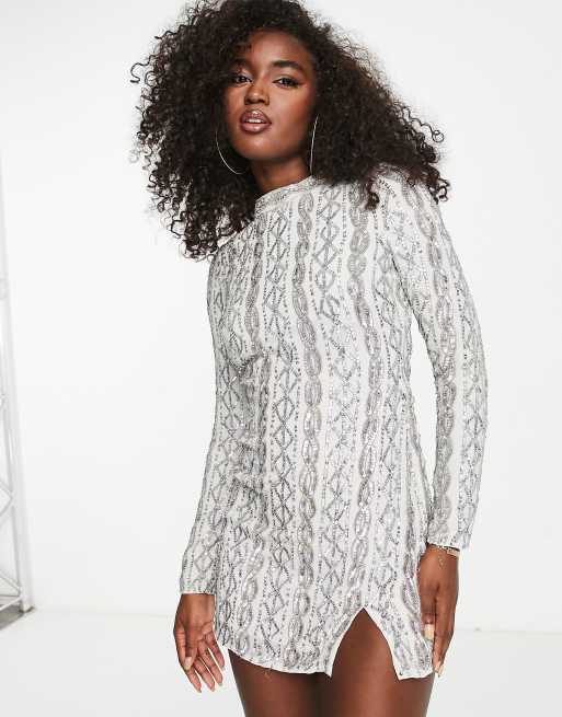 Miss Selfridge - Premium - Sølvfarvet minikjole med lange ærmer og udsmykkede rebdetaljer