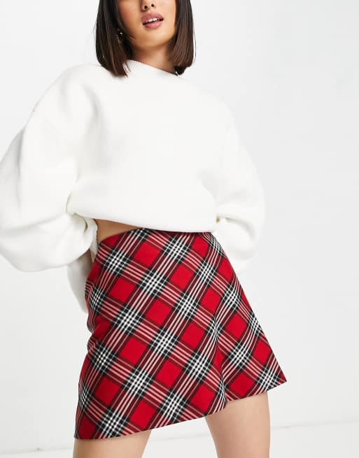 Miss Selfridge - Rød mininederdel med skotsktern og asymmetrisk snit