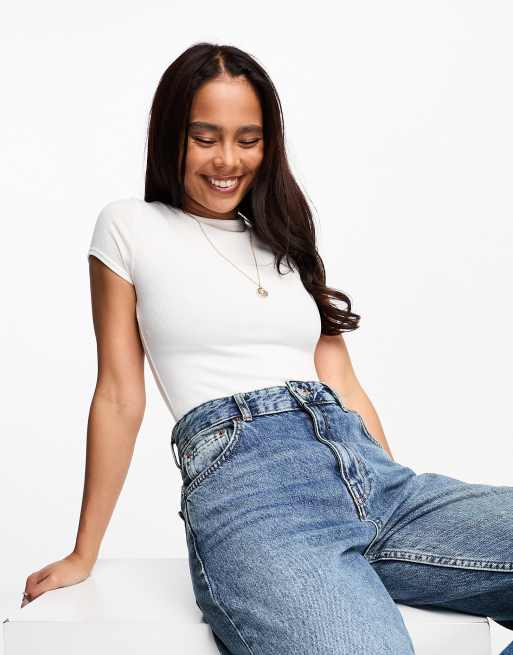 Miss Selfridge - Ribstrikket bodystocking med korte ærmer i hvid