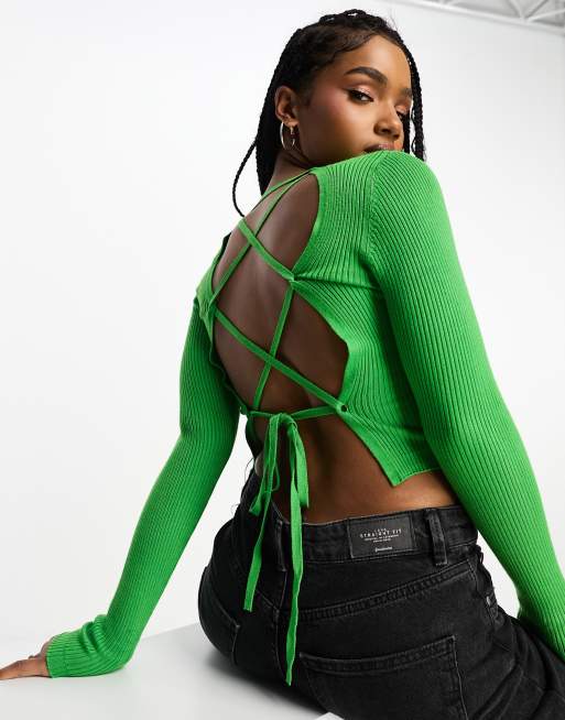 Miss Selfridge - Ribstrikket top med lange ærmer og gitterstropper på ryggen i sort