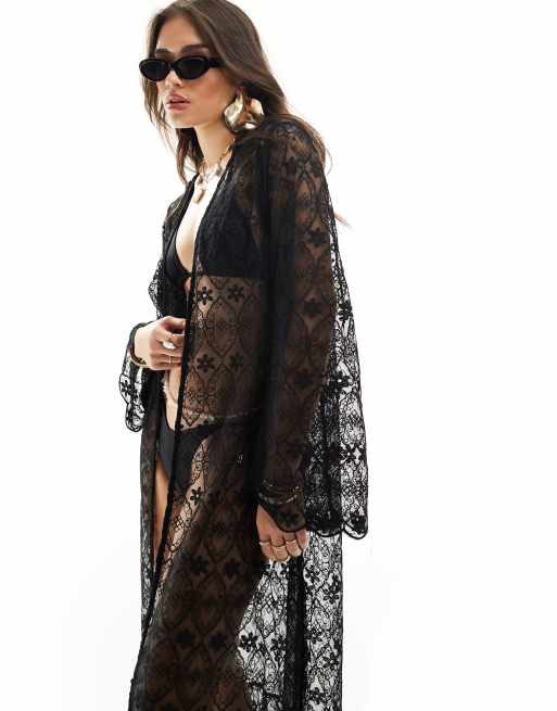 Miss Selfridge - Sort maxi-kimono med blonder og vide ærmer