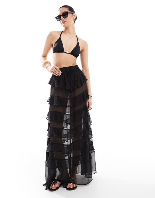 Miss Selfridge - Sort strand-nederdel i chiffon i maxilængde med niveauinddeling og flæser