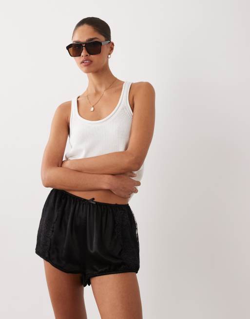 Miss Selfridge - Sorte shorts i satin med blondekant