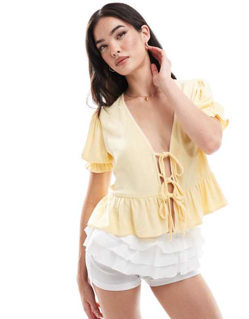 Miss Selfridge - Top med pufærmer, bindefront og hørlook