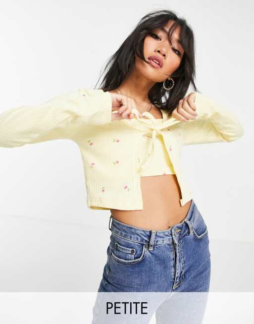 Missguided Petite - Ribstrikket cardigan- & camisole-croptop-sæt i gult med blomstermønster