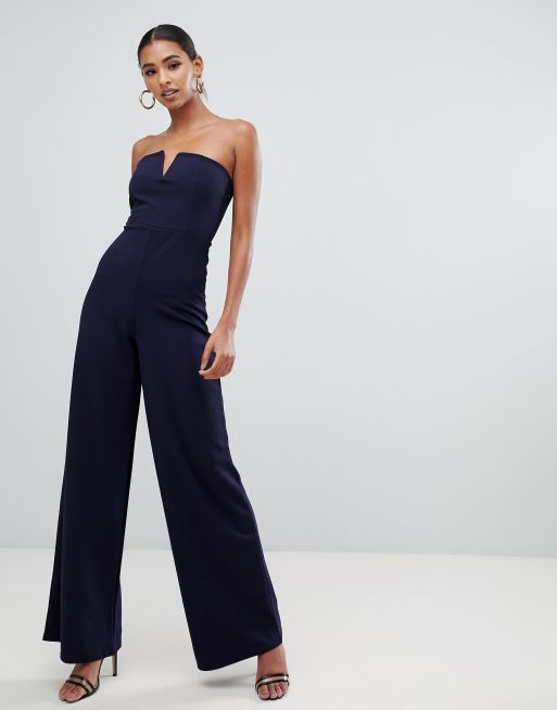 Marineblå heldragt i bandeau med vide ben og V-udskæring fra Missguided