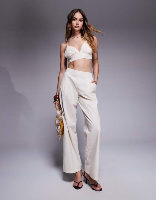 Missy Empire - Cremehvidt sæt med cropped bralette med cami-stropper og bukser med vide ben i hørblanding