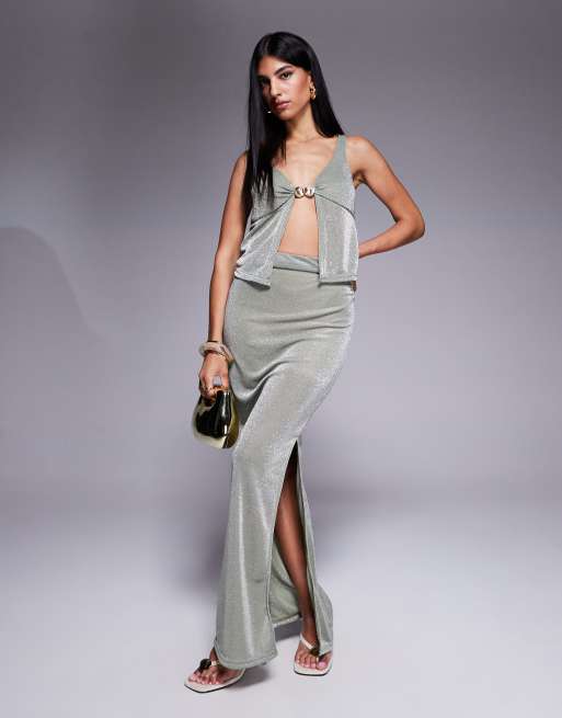 Missy Empire - Kakigrønt tætsiddende sæt med top med slids foran og metaldetalje og maxinederdel