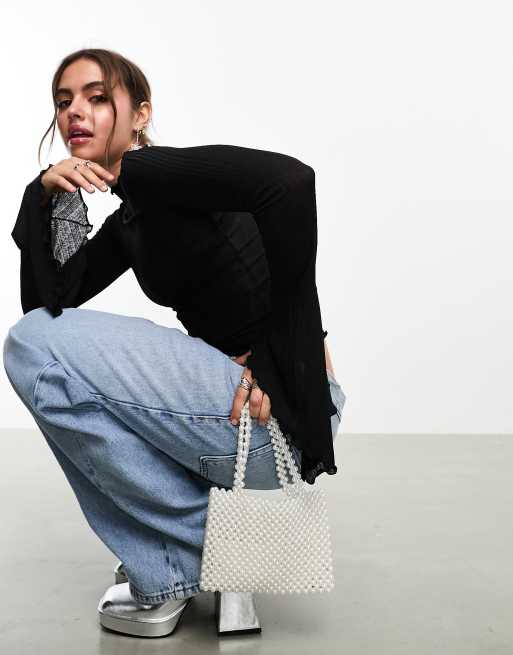 Monki - Højhalset og sort top med bølgekant og lange trompetærmer