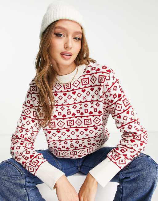 Monki - Jul - Beige striktrøje med rødt fairisle-mønster