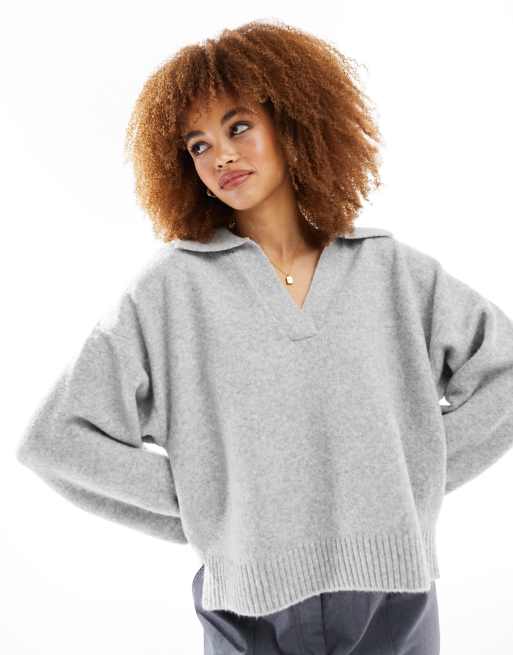 Monki - Langærmet og gråmeleret sweater med polokrave