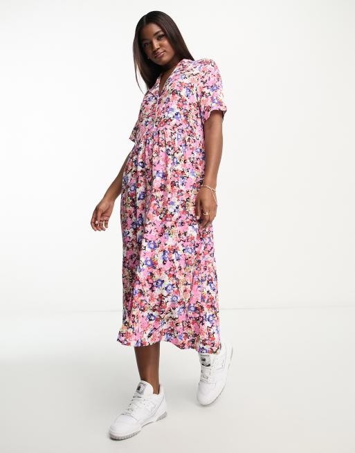 Monki - Midi-skjortekjole i pink blomstermønster