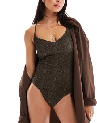 Monki - Mix and match - Brun badedragt med bindebånd på ryggen og slangeprint