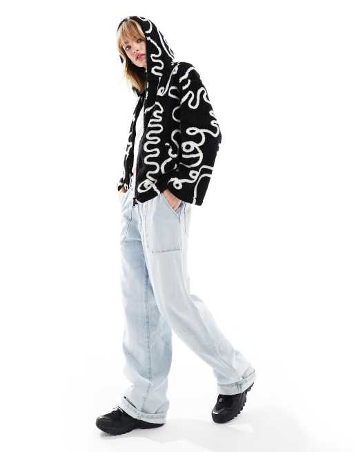 Monki - Monokrom og oversized sweater med hætte, lynlås fortil og krusedulleprint