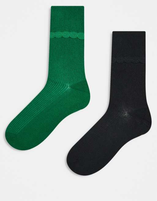 Monki - Pakke med 2 par sorte og grønne ankelsokker med flæsekanter
