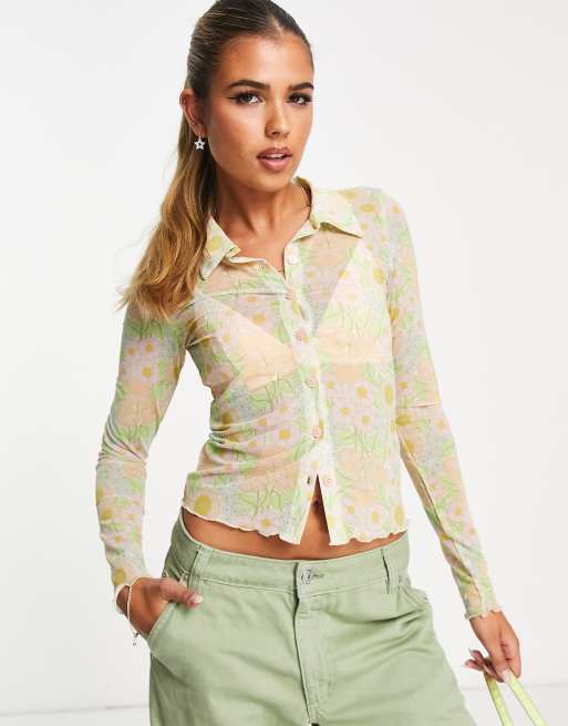 Monki - Pastelfarvet poloskjorte med retro-blomstermønster i mesh