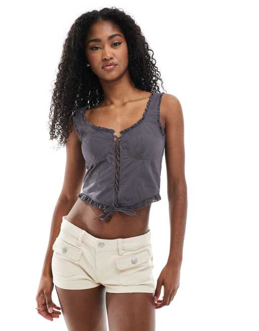 Monki - Råsort korset-top med flæsekanter og snører