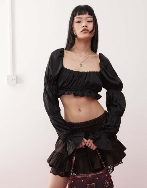 Monki - Sort rynket croptop med lange pufærmer i satin