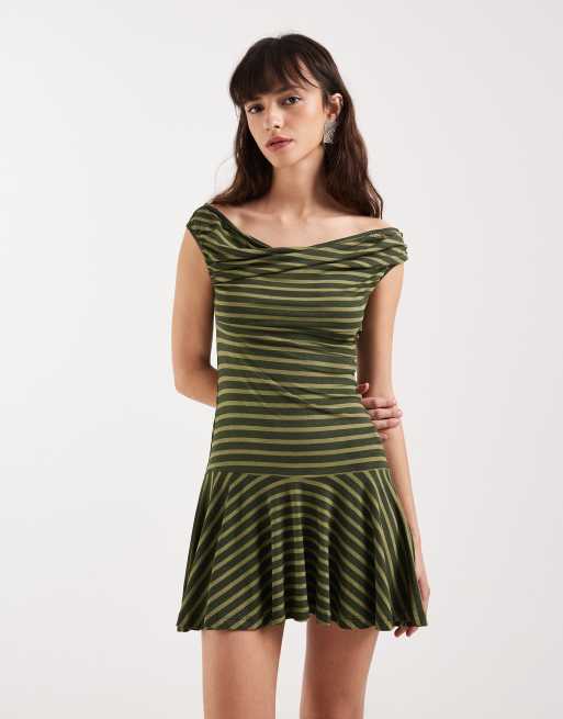 Motel - Mausari - Kakigrøn stribet og flagrende minikjole med offshoulder-design
