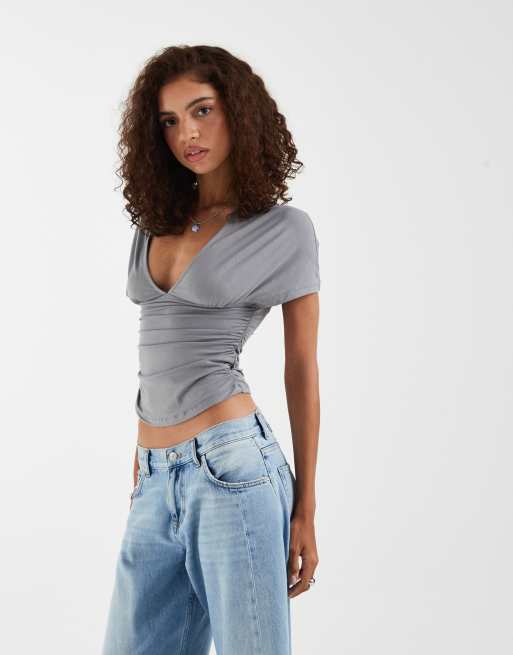 Motel - Osari - Grå top med dyb udskæring og flagermusærmer