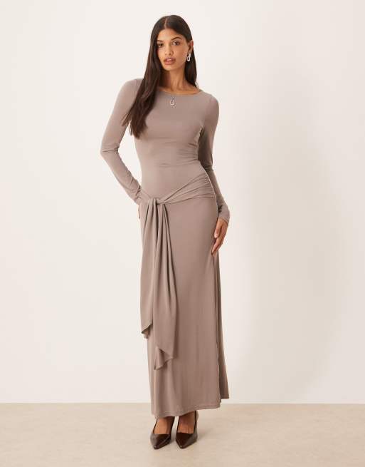 Motel - Zeya - Grå langærmet maxikjole med bindebånd