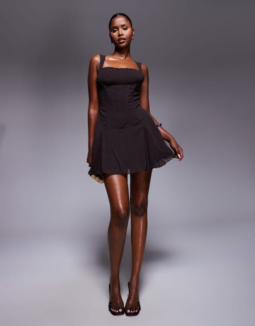 Murci - Chokoladebrun minikjole med korset-talje og plisseret kant i chiffon - Kun hos ASOS