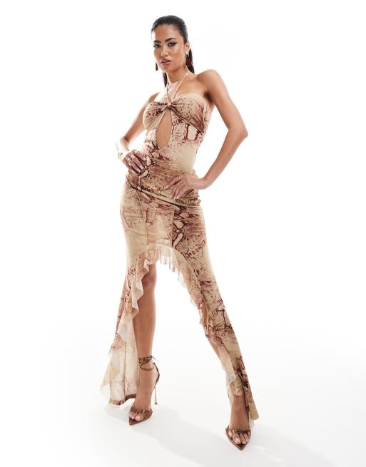 Murci - Halterneck-maxikjole med udskæring og asymmetrisk kant i mesh med slangeprint