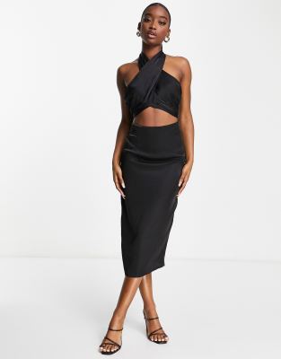NaaNaa - Midikjole i satin i sort med halterneck