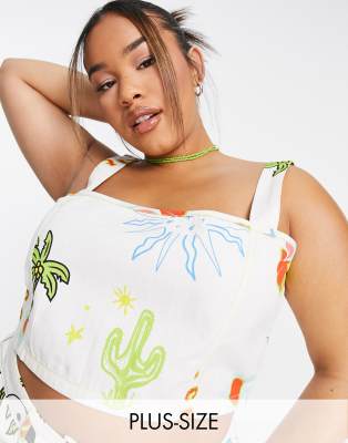 Native Youth Plus - Denim-korsettop med kontrastsyninger i blandet print - Del af sæt