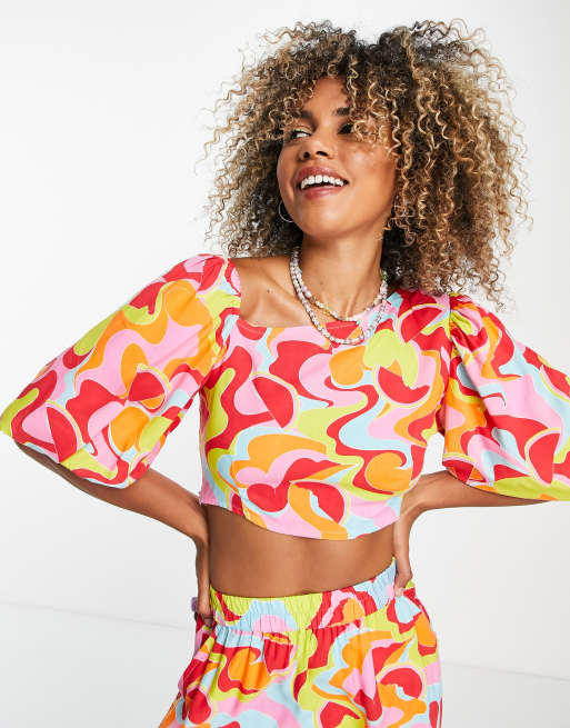 Native Youth - Asymmetrisk croptop med ærmer i abstrakt retrofrugtmønster - Del af sæt