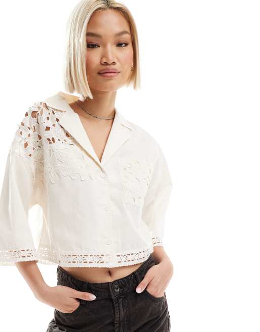 Native Youth - Hvid cropped skjorte med firkantet pasform og blondeindsatser