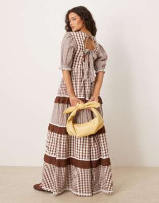 Neon Rose - Brun smock-kjole med flæsedetaljer, pufærmer og gingham-tern