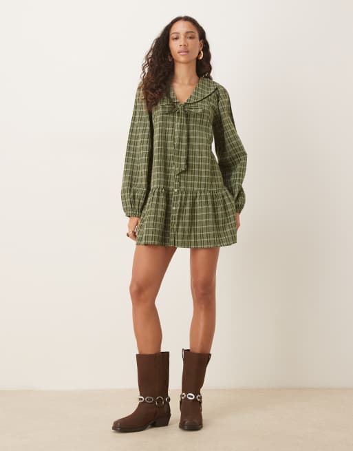 Neon Rose - Grøn smock-minikjole med sløjfedetalje og tern