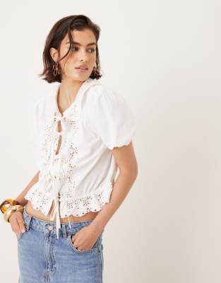 Neon Rose - Hvid bluse med pufærmer, bindebånd foran og broderier