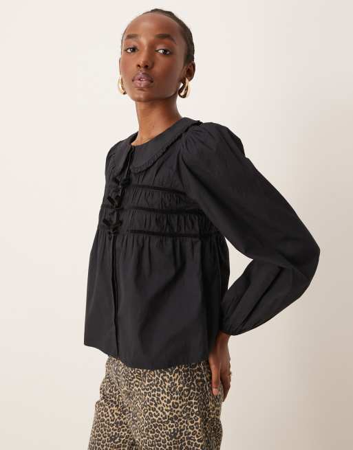 Neon Rose - Sort cropped bluse med sløjfedetaljer