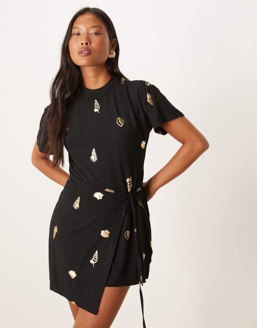 Never Fully Dressed Petite - Sort minikjole med guldfarvet strandskalsmønster