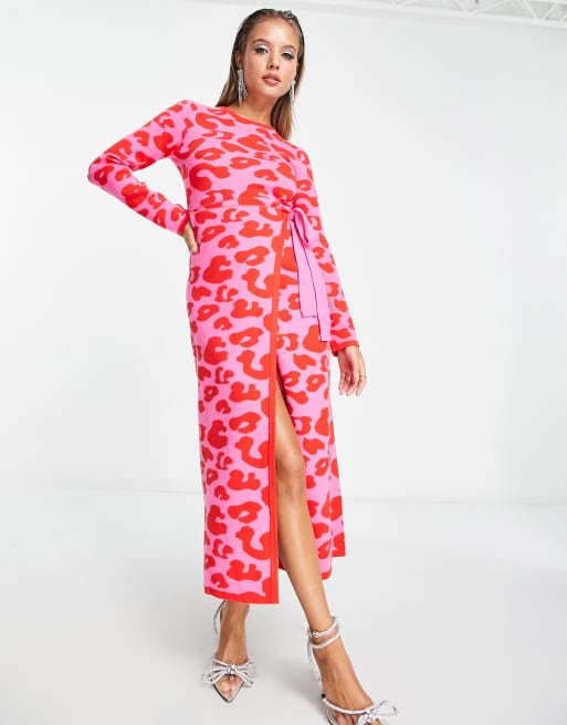 Never Fully Dressed - Strikket slå-om-midikjole med pink og rødt leopardmønster