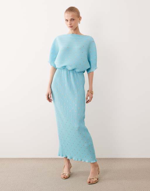 Never Fully Dressed - Tilly - Turkis offshoulder-maxikjole i plissé med metallic prikker