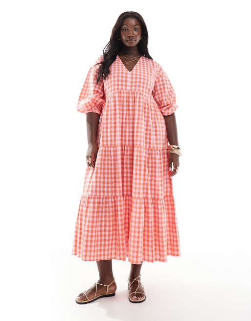 New Look Curve - Lyserød midikjole i seersucker med gingham-tern og smock