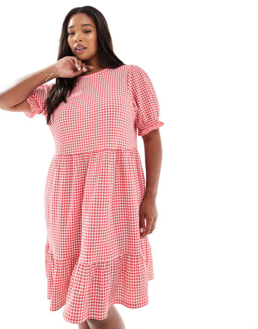 New Look Curve - Rød smock-minikjole med gingham-tern i krølstof