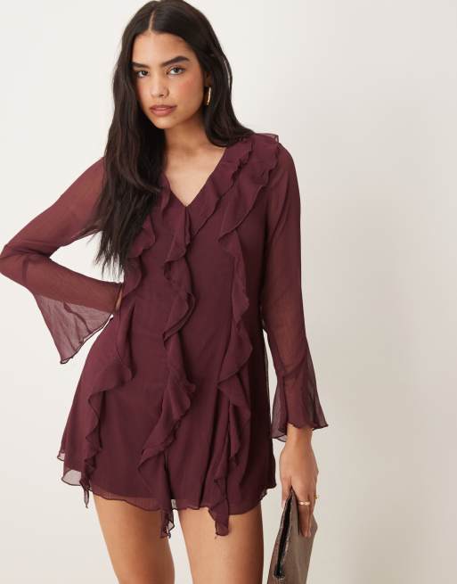 New Look - Bordeaux langærmet minikjole i chiffon med flæser