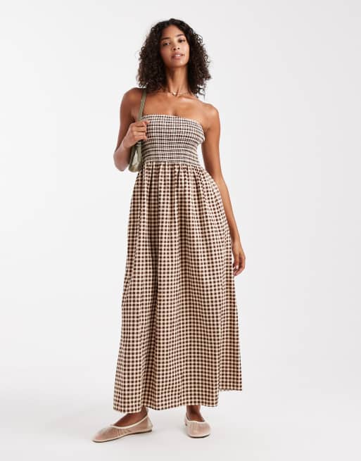 New Look - Brun midikjole med rynker og tern samt bandeausnit