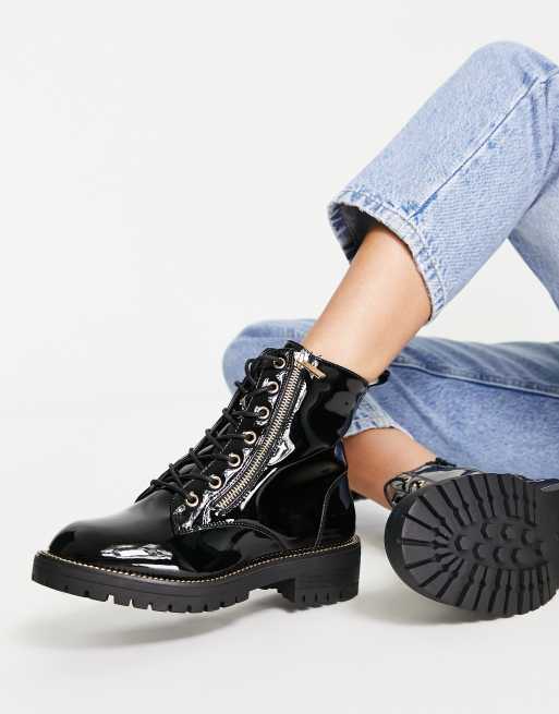 New Look - Flade støvler med snørebånd i sort lak