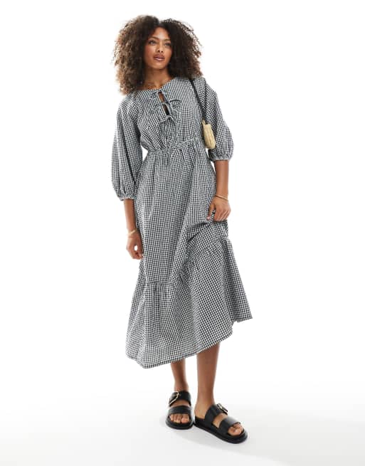 New Look - Midikjole med sorte gingham-tern og bindebånd fortil samt smock-tekstur