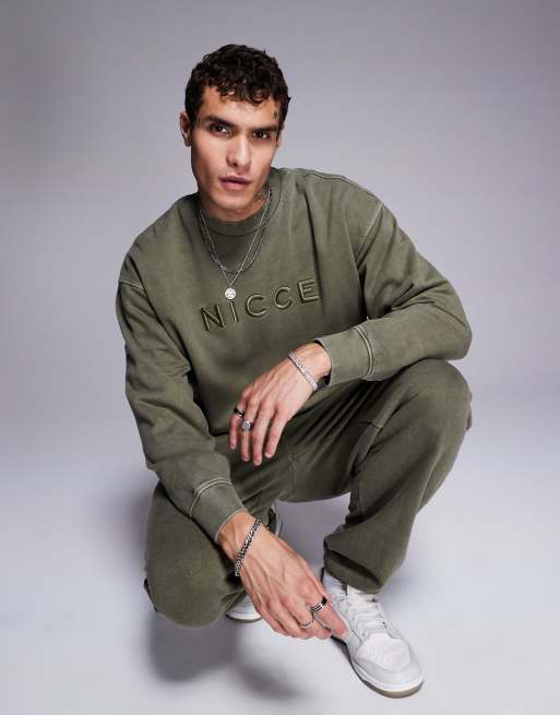 Nicce - Kakigrøn forvasket sweatshirt med rund hals og logo - Del af sæt