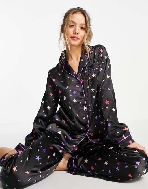 Night - Gavesæt med marineblå satinpyjamas i 5 dele med multifarvet stjerneprint