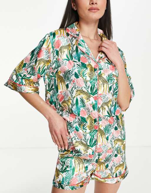 Night - Multifarvet kort pyjamassæt i satin med leopard- og rosenprint