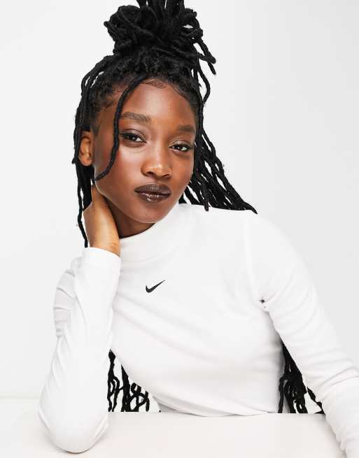 Nike - Essentials - Ribstrikket top med rullekrave, lange ærmer og lille Swoosh-logo i hvid