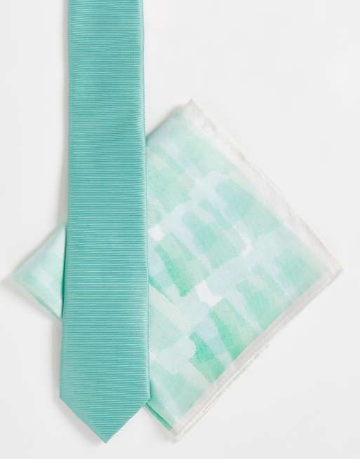 Noak - Salviegrønt smalt slips med for og lommeklud med abstrakt print