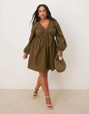 Nobody's Child Plus - Irene - Kakigrøn minikjole i boho-stil med ballon-ærmer